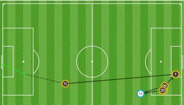 库尔图瓦不敢怠慢,抡起左脚大力踢向前场。这是一次平常无奇的传球(更像是解围),没有引发太多人的注意,甚至转播镜头都切走了。不过一转眼,姆巴佩就形成1v1的单刀,凭借超人的速度、爆发力,姆巴佩杀入禁区挑射破门!